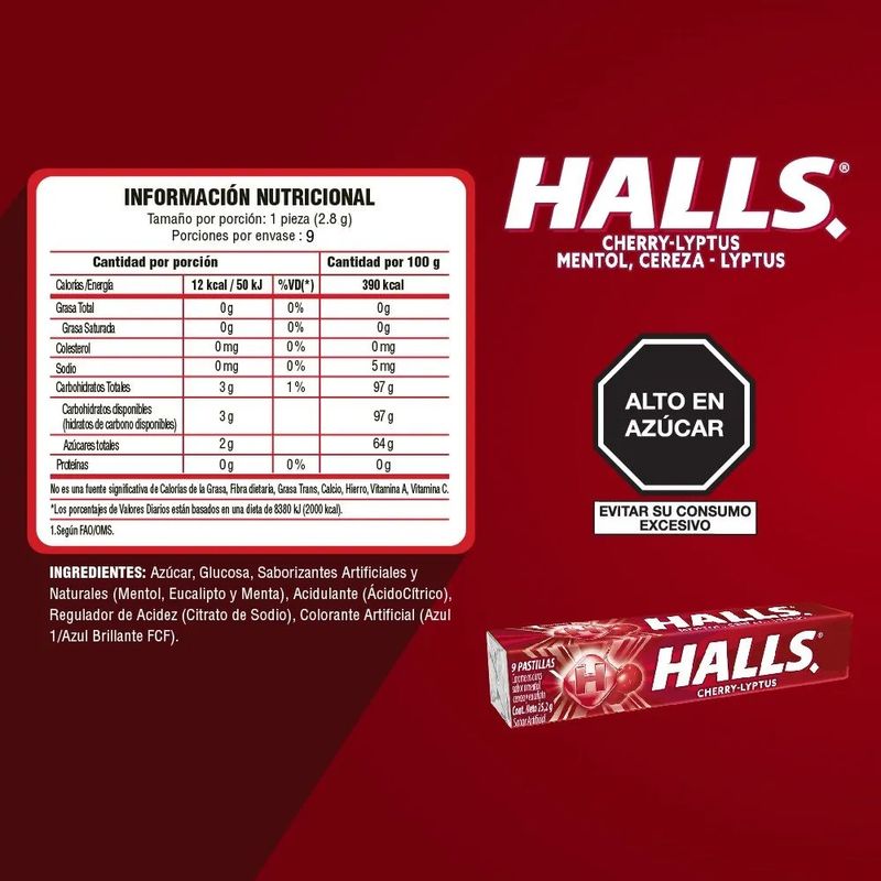 Caramelo HALLS cherry liptus caramelos duros sabor a menta, cereza y eucalipto.