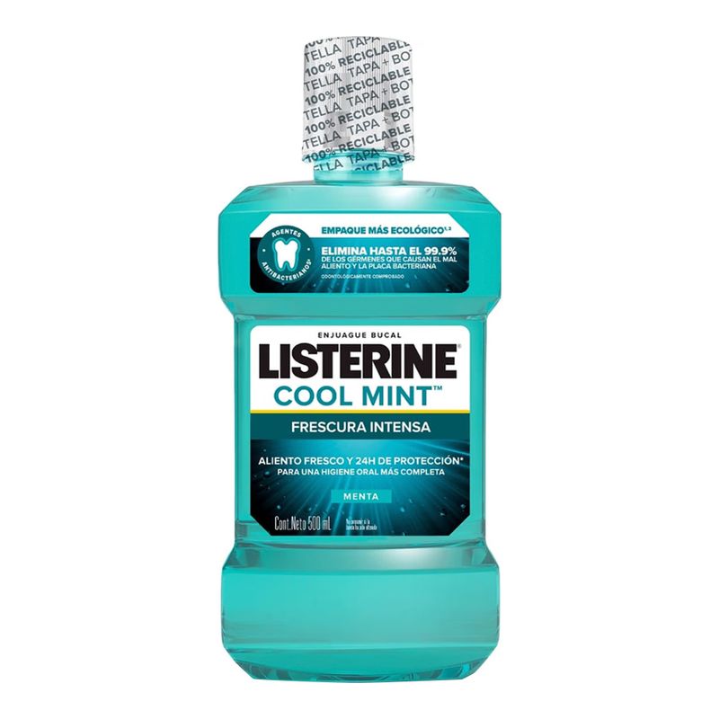 "Gracias a su fórmula única, Listerine Cool Mint con 4 Aceites Esenciales (mentol, timol, eucaliptol y salicilato de metilo) es efectivo en eliminar hasta el 99.9% de las bacterias*1 que causan la placa y el mal aliento. Además mantiene las encías saludables. Ninguna acción antibacteriana es más profunda que la de Listerine*2 con protección hasta por 24 horas*3.