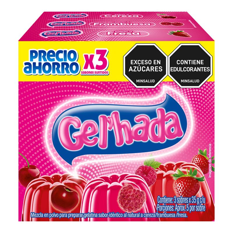 Compra Gelatina GEL'HADA cereza frambuesa y fresa 3 unds x35 g c/u. Producto disponible en Mercaldas
