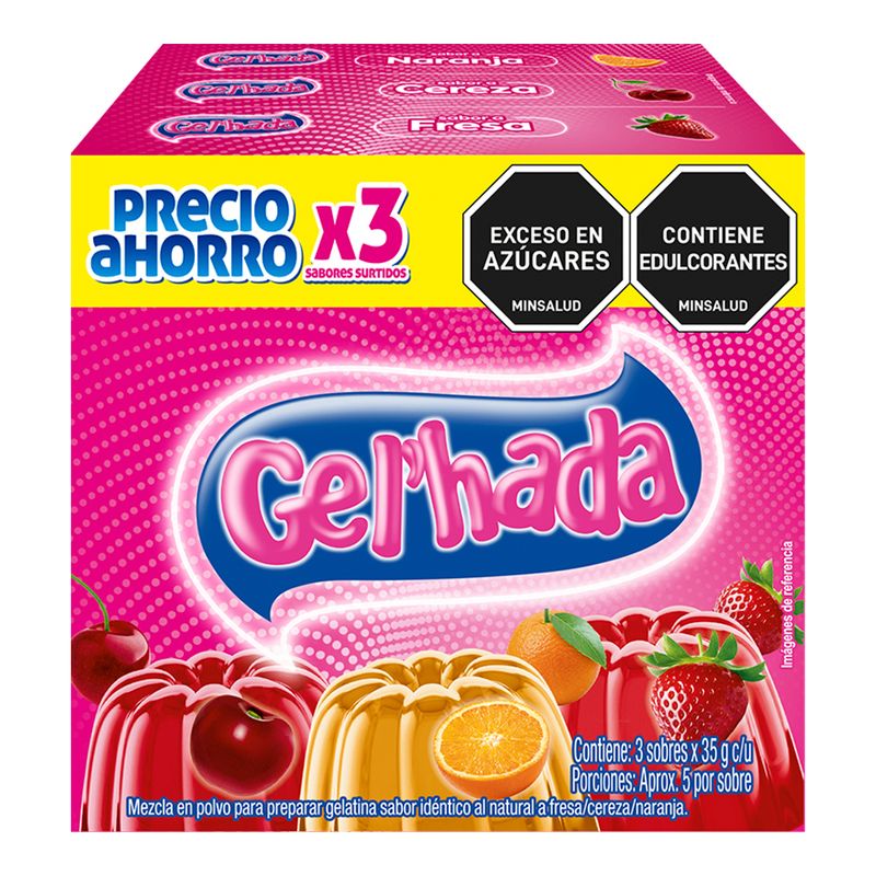 Compra Gelatina GEL'HADA fresa cereza y naranja 3 unds x35 g c/u. Producto disponible en Mercaldas
