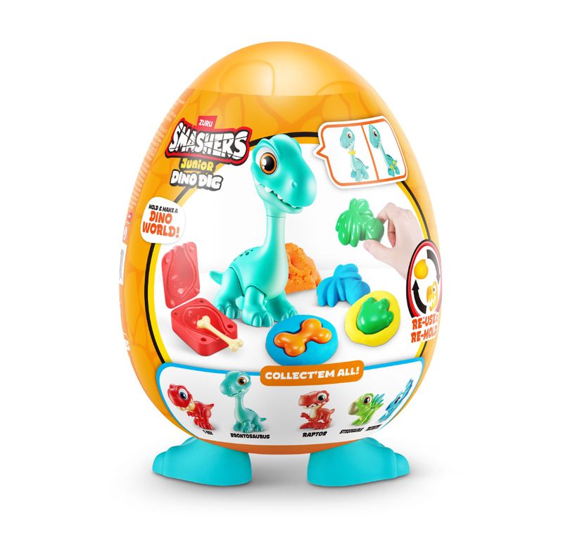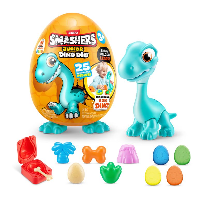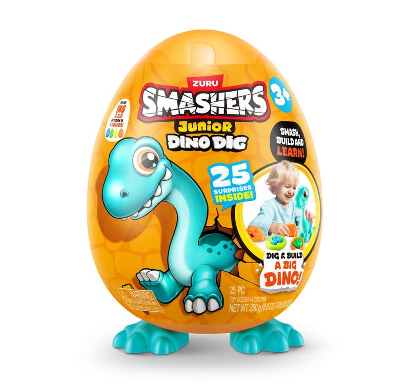 ¡Prepárate para la GRAN aventura de excavación con el Huevo Sorpresa Dinosaurio Junior Grande de Smashers! Diseñado para los pequeños exploradores, este huevo está repleto de sorpresas que les permitirán cavar, construir y aprender mientras se divierten. Los pequeños se enamorarán de excavar en la suave masa de dinosaurio para descubrir piezas ocultas y construir su nuevo amigo dinosaurio. ¡La aventura comienza con cada excavación! 25 sorprendentes sorpresas, cada huevo incluye un sinfín de sorpresas, entre ellas seis moldes para dar forma al increíble kilogramo de masa de dinosaurio. ¡Las posibilidades son infinitas!. El Smashers Junior Dino Dig es el juguete sensorial perfecto para ayudar a los niños a desarrollar sus habilidades motoras finas. Aplastar y moldear la masa no solo es divertido, ¡sino que también estimula su creatividad!. Cada huevo contiene un dinosaurio moldeable. ¿Encontrarás el temible T-Rex o el majestuoso Brontosaurus? ¡Construye tu propio mundo prehistórico!. Haz que tu dinosaurio cobre vida al mover sus brazos y cabeza. ¡Observa cómo pisa fuerte mientras los pequeños crean sus propias historias!.
