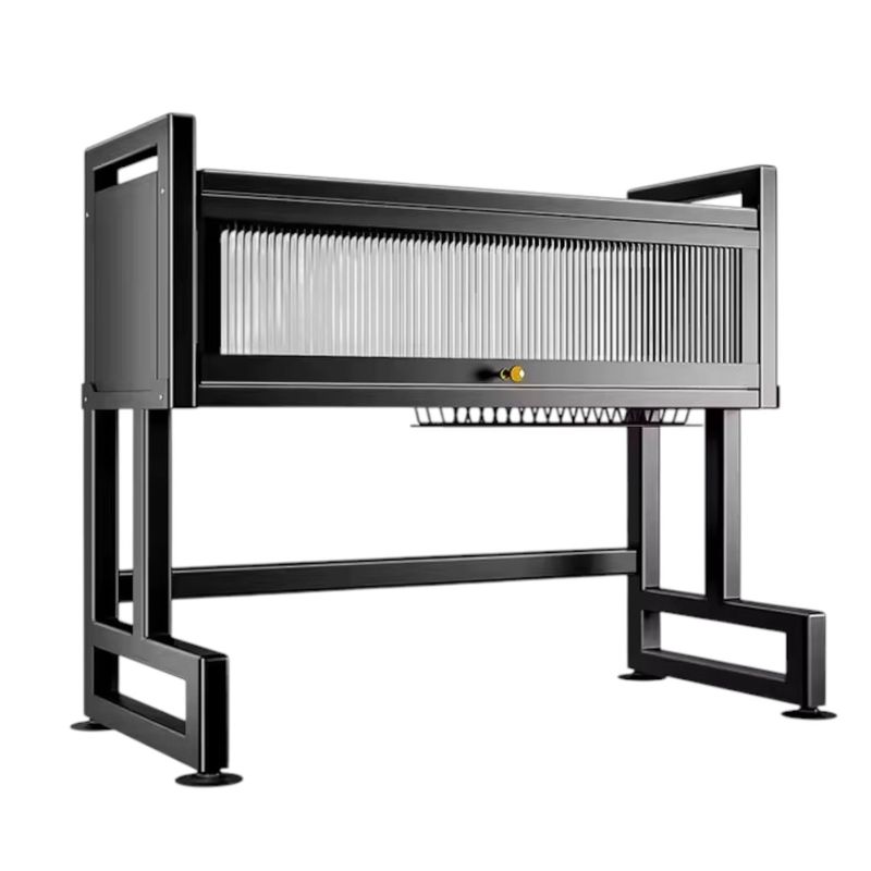 Incluye compartimiento superior para especias o recipientes, soporte para trapo de cocina y estructura elevada para aprovechar el espacio sobre el lavaplatos. Su diseño cerrado mantiene la higiene y su estilo industrial combina con cualquier decoración.