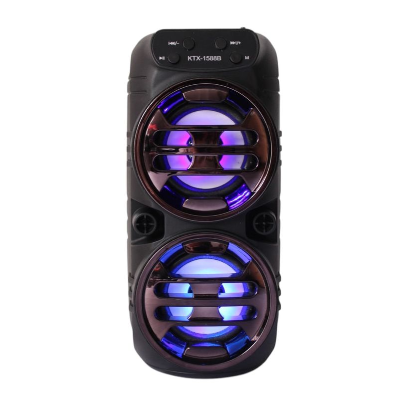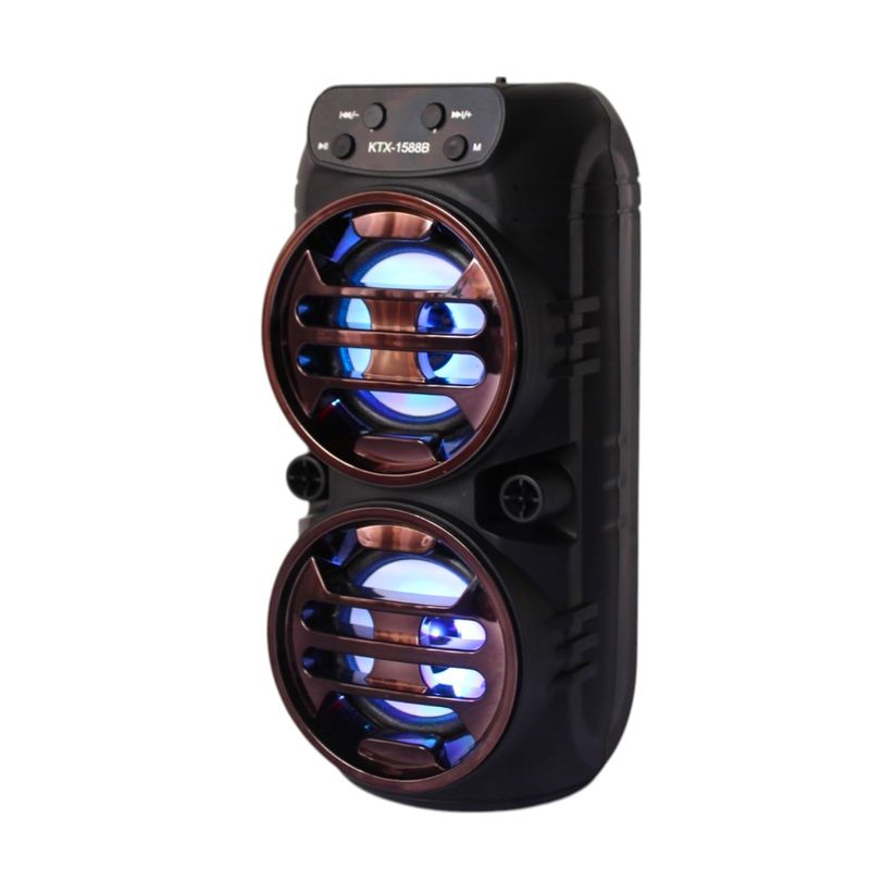 Descubre la potencia y el estilo con este parlante portátil con luces LED integrado. Diseñado para ofrecer un sonido nítido y envolvente, este parlante es ideal para animar cualquier ambiente, ya sea en casa, reuniones con amigos o fiestas al aire libre. Su conectividad Bluetooth te permite reproducir música sin cables desde tu celular o cualquier dispositivo compatible, mientras que las luces LED crean un efecto visual cautivador que se adapta al ritmo de la música.