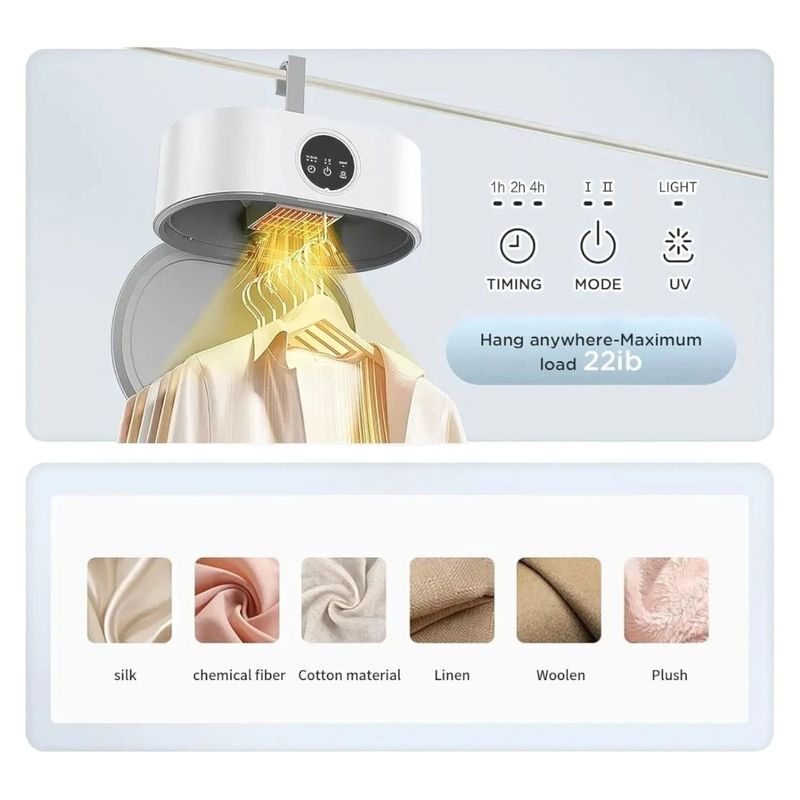 Seca tu ropa en cualquier lugar con este innovador secador portátil con tecnología de calor y luz UV. Ideal para apartamentos, viajes o climas húmedos, permite secar prendas delicadas como seda, lana o algodón sin dañarlas. Su diseño plegable, silencioso y eficiente ahorra espacio y energía. Incluye temporizador, múltiples modos de secado y capacidad para colgar hasta 10 prendas. ¡Tu ropa siempre seca, limpia y libre de bacterias!