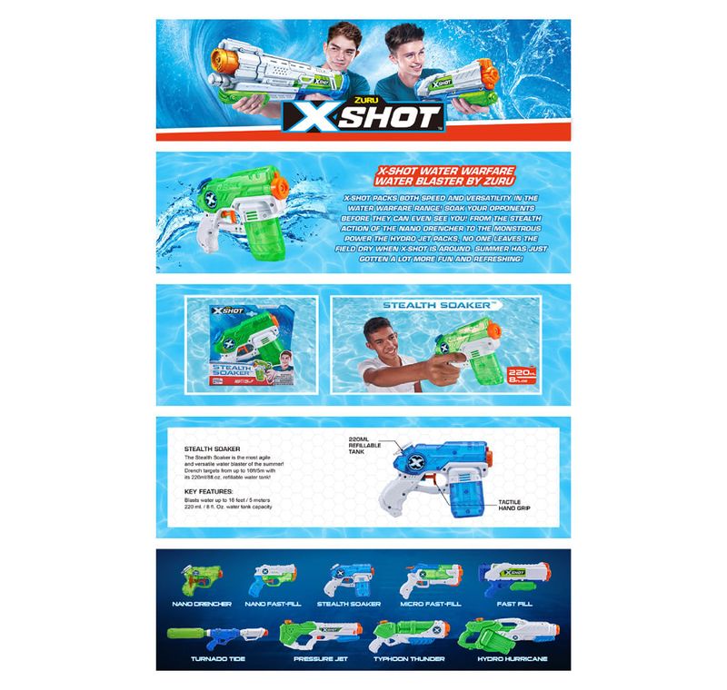 ¡Paquete de 2 lanzadores de agua Stealth Soaker para doble de diversión! El arsenal X-Shot Water Blaster ha llegado para la acción acuática extrema. Este pequeño y compacto Stealth Soaker te permite empapar a la competencia. No dejes que su tamaño te engañe; ¡Este blaster es el mejor para el mejor remojo! El Stealth Soaker puede volar hasta 16 pies / 5 metros. ¡Así que acércate sigilosamente y dale a la competencia una explosión sorpresa! ¡Usa dos empuñaduras o únete a un amigo con este paquete doble Stealth Soaker!