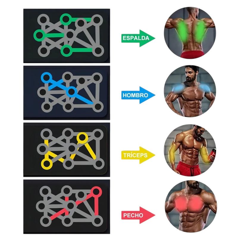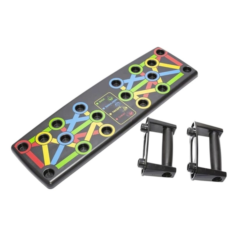 Transforma tu rutina de entrenamiento desde casa con esta tabla de flexiones multifuncional. Su diseño con colores guía permite trabajar grupos musculares específicos como pecho, espalda, hombros y tríceps, simplemente ajustando la posición de las manijas. Ideal para principiantes o avanzados, esta herramienta compacta y portátil es perfecta para mejorar fuerza, tonificar y definir tu cuerpo sin necesidad de ir al gimnasio. ¡Entrena de forma segura, efectiva y donde quieras!