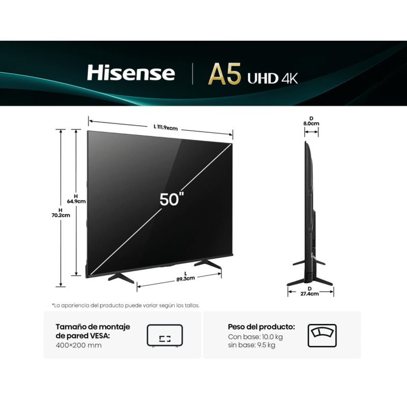 Transforma tu experiencia de entretenimiento con el televisor Hisense 50A5NV de 50 pulgadas. Este Smart TV ofrece imágenes nítidas en resolución 4K UHD (3840 x 2160 píxeles) y tecnología HDR con Dolby Vision y HDR10, que optimizan el contraste y los colores para una calidad superior. Su sistema operativo VIDAA U6 permite una navegación rápida e intuitiva, con acceso a aplicaciones como YouTube, Netflix y Prime Video. Además, cuenta con modos especiales como Modo Cineasta y Modo Juego, que ajustan la imagen para una experiencia auténtica y fluida. Su diseño delgado y elegante se adapta a cualquier espacio, mientras que el sonido DTS Virtual-X brinda un audio envolvente para sumergirte en tus contenidos favoritos.