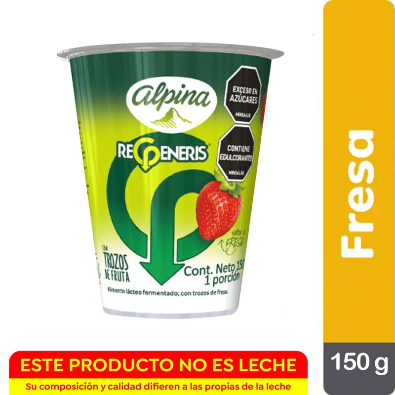 En Mercaldas compra Yogurt ALPINA regeneris fresa x150 g, es un alimento lácteo fermentado que contiene probióticos (cultivo Bifidobacterium lactis BB12) y fibra (soluble). El consumo diario de probióticos y fibra ayuda al adecuado funcionamiento del tránsito intestinal, acompañado de una dieta balanceada y ejercicio físico. Aporta naturalmente calcio y proteína de excelente calidad